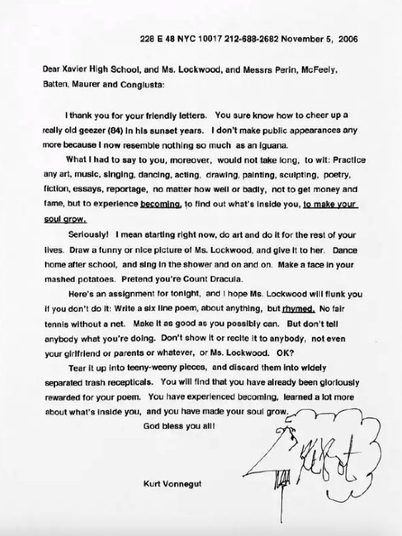 I love this 2006 letter from Kurt Vonnegut to Xavier High School students. The assignment by their English Teacher, Ms. Lockwood, was to write a persuasive letter to their favorite author asking them to visit the school. No authors visited and only Vonnegut replied. This was six months before he died.